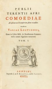 .1751. LIBRO: .(LITERATURA CLÁSICA). .TERENTII AFRI, PUBLII: .COMOEDIAE. Londini: Imp. J. et P. Knapton, 1751. 2 vol. en 4º menor. I: 13 h. + 208 p. + 3 lám. grabadas. II: 209 p. a 400 p. + 3 h. + 3 lám. grabadas. Portada a dos...