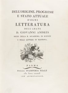 .1782. LIBRO: .(LITERATURA). .ANDRES, GIOVANNI: .DELL´ORIGINE, PROGRESSI E STATO ATTUALE D´OGNI LETTERATURA DELL´ABATE... 2 vols. Parma: Della Stamperia Reale, 1782. 2 vols. en 4º mayor. I: 2 h. + XIII p. + 1 h. + 531 p. II: XV + 515 p....