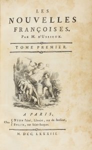 .1783. LIBRO: .(LITERATURA). .USSIEUX, M. D´: .LES NOUVELLES FRANÇOISES. Paris: Chez Nyon y Brunet, 1783. 3 vol. 8º mayor. Novelas cortas de unas 50 p. c. u, todas con portada propia y cada una adornada con un grabado fuera del texto y con...