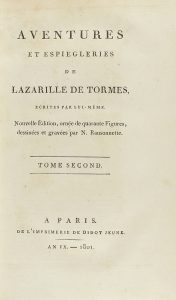 .1801.. LIBRO: .(LITERATURA ESPAÑOLA). .AVENTURES ET ESPIÈGLERIES DE LAZARILLE DE TORMES, ÉCRITES PAR LUI-MÊME.. Paris: Imp. de Didot Jeune 1801. 2 vol. en 8º mayor. I: Frontis + VIII + 154 p. + 21 lám. II: 2 h. + 182 p. + 18 lám. Con 40...