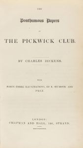 .1838.. LIBRO: .(LITERATURA). .DICKENS, CHARLES:. .THE POSTHUMOUS PAPERS OF THE PICKWICK CLUB. WITH FORTY THREE ILLUSTRATIONS BY R. SEYMOUR AND PHIZ.. London: Chapman and Hall (Bradbury and Evans, printers), 1838. 8º mayor. XIV+ 609 p.+ 43 grabados....