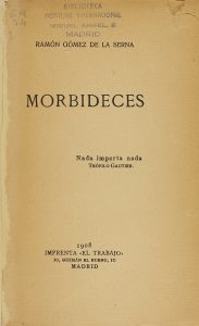 .1908.. LIBRO: .(LITERATURA). .GÓMEZ DE LA SERNA, RAMÓN:. .MORBIDECES. [DEDICATORIA AUTÓGRAFA DEL AUTOR].. Madrid: imprenta ´El trabajo´, 1908. 8º. 156 p.+ 2 h. Cubiertas originales con ligeras restauraciones en el lomo, pero muy buen ejemplar....
