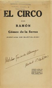 .[1917]. LIBRO: .(LITERATURA-GENERACIÓN 27). .GÓMEZ DE LA SERNA, RAMÓN: .EL CIRCO. PORTADA DE BARTOLOZZI. [DEDICATORIA AUTÓGRAFA DE GÓMEZ DE LA SERNA]. Madrid: Imprenta Latina [c. 1917]. [1917] 8º.128 páginas. Cubiertas originales, la...