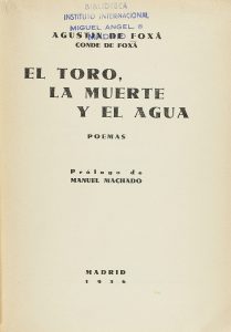 .1936.. LIBRO: .(LITERATURA). .FOXÁ, AGUSTÍN DE:. .EL TORO, LA MUERTE Y EL AGUA. POEMAS. PRÓLOGO DE MANUEL MACHADO.. Madrid: imprenta de Galo Sáez, 1936. 8º. 100 p. + 2 h. Cubiertas originales. Sello de la Bib. del Ins. Int. Expurgo. Etiqueta en...