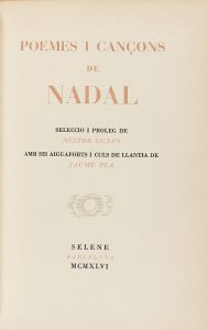 .1946. LIBRO: .(LITERATURA-BIBLIOFILIA). .POEMES I CANÇONS DE NADAL. Selecció i proleg de Nestor Lujan. Con seis aguafuertes y culs-de-lampe de Jaume Pla. Barcelona: Ed. Selene, 1946. 8º. 116 p. Edición de 150 ejemplares numerados sobre papel...