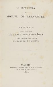 .1870. LIBRO: .(CERVANTINA). .MOLINS, MARQUÉS DE: .LA SEPULTURA DE MIGUEL DE CERVANTES. MEMORIA ESCRITA POR ENCARGO DE LA ACADEMIA ESPAÑOLA. Madrid: Imp. M. Rivadeneyra, 1870. 8º. 228 p. y 3 lám. plegadas, dos son genealogías y la...