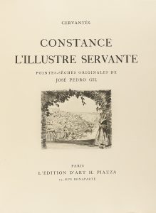 .1931.. LIBRO: .(LITERATURA ESPAÑOLA-BIBLIOFILIA). .CERVANTES, MIGUEL DE:. .CONSTANCE L´ILLUSTRE SEVANTE.. Paris, H. Piazza, 1931. 4º. 5 h. + 85 p. + 5 h. Ilustr. con puntas secas originales de José Pedro Gil: 49 grabados entre el texto, 3 a toda...