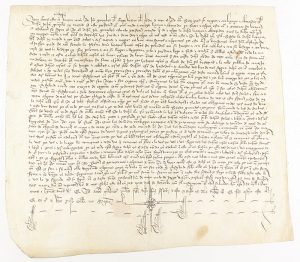 .1400. MANUSCRITO: .(PERGAMINO). .CONCESIÓN DE JUAN GONZALEZ DEL FIERRO. Manuscrito sobre pergamino de 29 x 35 cm. Documento oficial en el que D. Juan González del Fierro otorga a su mujer por escritura notarial, unos bienes. Al pie del documento...
