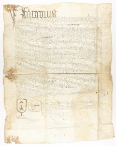 .145? ca.. MANUSCRITO: .(PERGAMINO). .COPIA DE UNOS ESCRITOS DEL ARCHIVO DE UNA DIÓCESIS.. Manuscrito sobre pergamino de 45 x 35 cm. Bonita letra capital y firma notarial con dibujo de una flecha con una luna al pie del escrito. Al parecer reproduce...