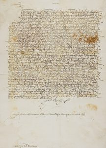 secretario del rey. Pequeñas manchas de óxido. Restauración con pérdida en las primeras lineas de texto. Restos de sello de lacre.
