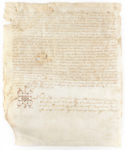 Consta de dos apartados, el primero de ellos es la herencia y capítulos matrimoniales concertados entre Joan Pradas y Anna Bartomeu; el segundo apartado es la donación de 60 libras en moneda barcelonesa en concepto de dote para Anna B., realizada por su hermano Amèric Bartomeu. El segundo pergamino lleva fecha de 26 de septiembre de 1628, firmado en Girona ante el mismo notario, es el ápoca de pago de la redención de un censal de 200 libras en moneda barcelonesa y de 200 sous de la misma moneda de pensión anual hecha por Montserrada Pol. Algún agujerito que afecta alguna palabra en el texto.