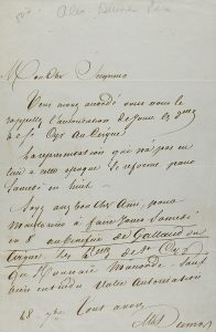 .1850 ca.. MANUSCRITO: .DUMAS, ALEJANDRO:. .CARTA MANUSCRITA Y FIRMADA POR ALEJANDRO DUMAS PADRE.. Cuartilla plegada de papel azulado con el texto redactado por el escritor Alejandro Dumas (padre) en la que solicita autorización. Redactada con...