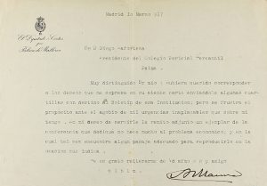 .1917. MANUSCRITO: .MAURA, ANTONIO: .CARTA MECANOGRAFIADA DIRIGIDA A DIEGO ZAFORTEZA. Cuartilla, apaisada. Con memebrete de Diputado a las Cortes por Palma de Mallorca, firma autógrafa de A. Maura. Se acompaña de una litografía con retrato del...