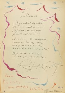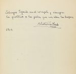 álbum perteneció a la esposa del Dr. Emilio Mira y López. La pareja se exilió a Argentina, de 1940 a 1977, tras la guerra civil española. El álbum contiene más de 120 firmas, muchas con dedicatorias, dibujos originales o incluso una pequeña melodía en un pentagrama improvisado; la primera de ellas es del año 1949 y la última de 1978. Casi todas realizadas en Buenos Aires, aunque hay alguna hecha en el Cairo, Santiago de Chile, Montevideo y Barcelona. Los firmantes son personajes destacados del mundo literario, político, artistas y músicos de renombre mundial. Destacamos las firmas de Rafael ALBERTI y Mª Teresa León que se acompaña de trazos de color por él mismo; Jaume Pahissa; Joaquin Rodrigo; Macaya, acompaña la firma con un dibujo a plena página; Nora Borges, con dibujo; QUINQUELA MARTIN, un dibujo a plena página dedicado y una fotografía del arista argentino mientras dibujaba; Gilardo Gilardi quien acompaña su firma con unos compases de una de sus composiciones; Gori Muñoz con un dibujo a plena página; Xavier CUGAT, con un dibujo; Margarita XIRGU; Claudio Arrau; Joan Margarit; Arthur RUBINSTEIN; Maurice Chevalier; Andrés Segovia; Frederic MOMPOU, Xavier MONTSALVATGE, Pau CASALS las tres acompañadas de algunos acordes realizados a mano; Victoria KENT; el compositor alemán Paul HINDEMITH. Disponemos de la lista completa. Enc. en plena piel con ruedas doradas en los planos, rozada y cajo sesgado, presentado en un estuche.