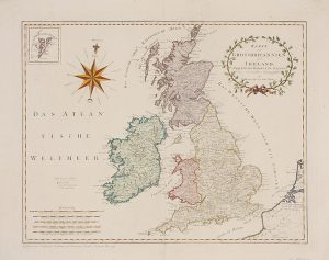 .1795. MAPA: .(GRAN BRETAÑA E IRLANDA). .REILLY, FRANZ. JOH. JOS. VON: .KARTE VON GROSSBRITANIIEN UND IRELAND. Mapa calcográfico, iluminado a mano. Papel 57 x 71 cm. Huella 51 x 63 cm. Leves puntos de óxido marginales.