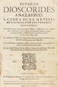 .1651. LIBRO: .(MEDICINA-BOTÁNICA). .DIOSCORIDES ANAZARBEO, PEDACIO: .A CERCA DE LA MATERIA MEDICINAL, Y DE LOS VENENOS MORTIFEROS. Traducido de la lengua girega, en la vulgar castellana (...) por el doctor ANDRES DE LAGUNA. Valencia:...