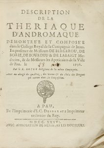 .1736. LIBRO: .(MEDICINA). .BOYER, F.: .DESCRIPTION DE LA THEARIAQUE D´ANDROMAQUE DEMONTRE´E ET COMPOSE´E DANS LE COLLEGE ROYAL DE LA COMPAGNIE DE JESUS. Pau: Imp. I. C. Desbaratz, 1736. 8º mayor. 2 h. + 41 p. Pequeño opúsculo en el que...