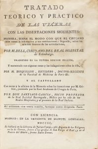 LAS ARTICULACIONES. Madrid: En la Imprenta de Manuel Gonzalez (se hallará en la Libreria de Julian Campo), 1790. 8º mayor. 4 h. + 200 p + 92 p. + 2 h. y un grabado. Primera edición. Cerco de humedad en la parte superior de la obra, que afecta las primeras páginas. [Sigue:] .UNDERWOOD: TRATADO SOBRE LAS ÚLCERAS DE LAS PIERNAS, DONDE SE EXAMINANA CON SINCERIDAD TODOS LOS MÉTODOS CURATIVOS... Id., 1791. 4 h. + 192 p. Primera edición. Dos obras enc. juntas en un vol. en pasta española, cortes pintados, rozada.