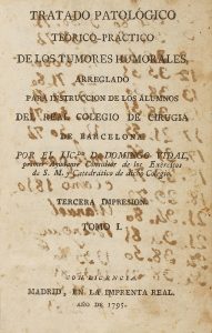 .1795. LIBRO: .(MEDICINA). .VIDAL, DOMINGO: .TRATADO PATOLÓGICO TEÓRICO-PRÁCTICO DE LOS TUMORES HUMORALES, ARREGLADO PARA INSTRUCCION DE LOS ALUMNOS EL REAL COLEGIO DE CIRUGIA DE BARCELONA. Madrid: En la Imprenta Real, 1795. 12º. 4 h. + 167...