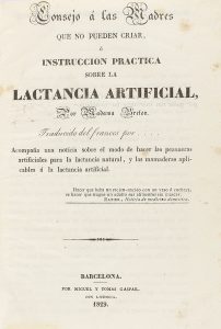 grabados. Enc. en cartoné papel al agua. NUC y BNP atribuyen la obra a Félix Séverin Ratier. Según el CCPBE 565731-8 solo se concocen dos ejemplares de esta obra en bibliotecas públicas españolas. Raro. Podría tratarse de la primera publicación en castellano sobre la lactancia artificial en España.
