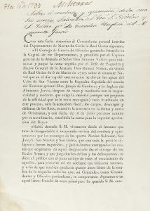 .1799. FOLLETO: .(MILITAR). .CONSEJO DE GUERRA DE OFICIALES GENERALES (...) PRESIDIDO POR EL CAPITAN GENERAL DE LA ARMADA EL SEÑOR DON ANTONIO VALDÉS... 2 h. impresas sobre fol. Con cuatro líneas manuscritas de época en el margen superior. Se...