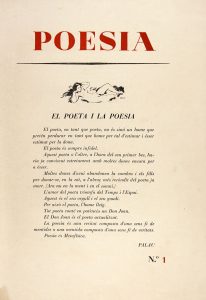 de 100 ejemplares en papel de hilo Guarro. PRIMERA EDICIÓN, RARÍSIMA, de la PRIMERA REVISTA LITERARIA CLANDESTINA CATALANA DE POSGUERRA. Poesía es la aventura personal de Josep Palau y Fabre. La revista nació en 1944 con la voluntad de trazar una línea de conducta poética y mantener un cierto rigor intelectual. La calidad formal fue una de las características de la revista. Con respecto a los textos, algo condicionada por los contactos de Palau y Fabre, así es una revista bastante diversa pero con voluntad de mantener la modernidad, como se puede comprobar especialmente en el número 3 con un texto de J.V. Foix, donde defiende la poesía-experimentación basada en el SIMBOLISMO y el SURREALISMO. En general, la lista de autores extranjeros citados o traducidos es básicamente francesa: Apollinaire, Aragon, Lautréamont, Éluard, etc. Por esto se reivindica el surrealismo, en el número 13, se reproduce la MANO DE MIRÓ sobre los Textos del vidente de Rimbaud y se transcriben fragmentos del primero y segundo MANIFIESTO SURREALISTA. Respecto a la LITERATURA CATALANA textos: JOAN PERUCHO, JORDI SARSANEDAS, CLEMENTINA ARDERIU, CARLES ORILLA, JOAN TRIADÚ, SALVADOR ESPRIU.