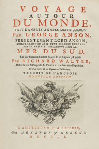 grabados [Sigue:]. Idem: VOYAGE DE LA MER DU SUD, FAIT PAR QUELQUES OFFICIERS COMMANDANTS, LE VAISSEAU DE WAGER. Pour servir de suite au Voyage de George Anson... Lyon: Imp. Frères Duplain, 1756. 2 h. XVI + 185 + XIV p. 2 volúmenes en 4º encuadernados en plena piel de época con dorados en el lomo y cantos. Buen estado e conservación.