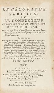 .1769. LIBRO: .(LOCAL). .LE GÉOGRAPHE PARISIEN, OU LE CONDUCTEUR CHRONOLOGIQUE DES RUES DE PARIS. Paris: Ed. Valleyre, Duchesne, Parault, Desaint, Delalain, 1769. 2 vol. en 8º mayor. I: 4 h. + 386 p. + 2 h. + 20 planos, 9 de ellos plegados. II:...
