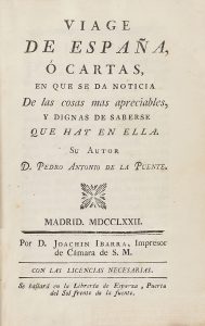 .1772. LIBRO: .(VIAJES). .PUENTE, PEDRO ANTONIO DE LA : .VIAGE DE ESPAÑA, Ó CARTAS EN QUE SE DA NOTICIA DE LAS COSAS MAS APRECIABLES, Y DIGNAS DE SABERSE QUE HAY EN ELLA. Madrid: Imp. Joachin Ibarra, 1772. 8º. 4 h. + 380 p. Enc. en plena...