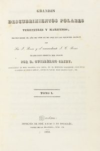 vol. en 8º mayor. I: 1 h. + 320 p. II: 287 p. III: 224 p. + 1 mapa plegado (48,5 x 60,5 cm) de las reginones árticas grabado al aguafuerte. Enc. en pasta española rozada, cortes pintados y lomera cuajada. Primera edición. Palau 278927.