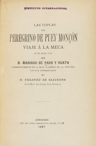 .1897. LIBRO: .(VIAJES- LA MECA). .PANO Y RUATA, MARIANO DE: .LAS COPLAS DEL PEREGRINO DE PUEY MONÇÓN, VIAJE Á LA MECA EN EL SIGLO XVI. Zaragoza: Tip. de Comas Hermanos, 1897. 8º menor. XLVI páginas, 1 h. + 303 p.+ 3 h., un mapa a doble...