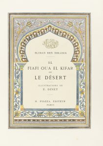 presentado en petaca. Edición numerada de 450 ejemplares sobre papel de hilo en las manufacturas Blanchet et Kléber. Exlibris. Encontramos una recopilación de cuentos saharianos, ilustrades a color y con gouache para resaltar el dibujo. Vemos el aprecio que tenía el pintor Dinet por el pueblo musulmán ya que estuvo 30 años en Algeria y se apasionó por la cultura islámica, finalmente abrazó su religión.