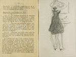 Refleja diversos viajes a Francia a lo largo de 1937. En el reverso de la cubierta posterior un dibujo a lápiz de una señora recogiendose el pelo. Acompañado de un certificado de autenticidad manuscrito y firmado por Josep Maria Cadena. [Más:] Carta manuscrita de J. Puig i Tarrats, de la editorial B. Bauzá (uno de los embriones de TBO), reclamando los dibujos de Opisso para la revista Mar i Cel. [Más:] Recorte de papel manuscrito de 4 líneas con pequeño dibujo, posiblemente del artista, aunque no hay firma.