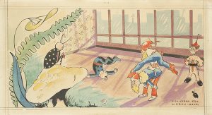 .1940 ca. ORIGINAL ARTÍSTICO: .(TEBEO). .GALCERÁN, R.: .ORIGINAL ARTÍSTICO DE R. GALCERAN. Tinta sobre papel de gramaje alto, en color. 17,5 x 31,5 cm. Firmado R. GALCERAN-D´OC-GIRBAU-NADAL.