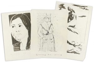 .1954-1955. ORIGINAL ARTÍSTICO: .HERNÁNDEZ PIJUAN: .TRES ORIGINALES. sobre papel en 4º y 4º mayor. Originales en tinta, dibujados en libreta, el margen izquierdo marcas de los dientes del papel. Todos firmados por el artista y fechados.