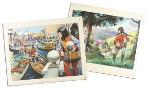 .1980-2000 ca. ORIGINAL ARTÍSTICO: .LOTE DE 57 ILUSTRACIONES ORIGINALES DE LA SERIE REALIZADA PARA LA ENCYCLOPAEDIA BRITANNICA BAJO EL EPÍGRAFE GENIOS DEL ARTE. Técnica mixta (carboncillo, pastel...), originales para las series de .TIZIANO (22...
