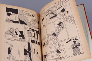 Bruxelles, Les Editions du Petit Vingtième, 1932. Edition originale. Album à reliure amateur de toile rouge, titre doré en long au dos et au premier plat, reproduction de la couverture en couleurs, (123) p. Mention de sixième mille. Crayonnages en couleurs aux pages 2 à 4. Rares petites déchirures marginales sans perte, sinon intérieur frais.