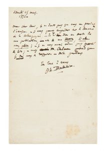 Lettre autographe signée de Baudelaire à un destinataire inconnu. Il lui demande de parler de sa dernière publication, « Je ne doute pas que vous ne preniez l’occasion - si vous pouvez empiéter sur le domaine de la bibliographie – et dire un mot de ma publication - et de ma Notice, si elle vous plaît ».