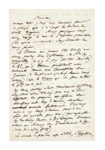 Lettre autographe signée de Baudelaire à Mario Uchard, auteur de pièces de théâtre et de romans, et futur directeur littéraire du journal Le Nord, où Baudelaire essaiera de faire publier quelques poèmes. Baudelaire se livre ici à une fine analyse du dernier roman de Mario Uchard, Raymon. Il préfère la deuxième partie qu’il « trouve puissante et enlevante comme une conception de Godwin (le compliment est vif, comme vous voyez) […]. Vos personnages parlent trop souvent avec les locutions des gens du monde. J’aimerais mieux qu’ils se servissent d’un style moins vrai et moins mondain. »