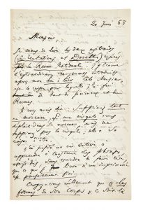 Lettre autographe signée de Baudelaire à l’éditeur Gervais Charpentier, directeur de la Revue nationale et étrangère. Baudelaire, très mécontent, lui fait part de sa désagréable déconvenue de constater que ses textes, publiés dans la Revue nationale, ont été corrigés sans son accord : « Je viens de lire les deux extraits (Les Tentations et Dorothée) insérés dans la Revue Nationale. J’y trouve d’extraordinaires changements introduits après mon bon à tirer. […] J’ai passé ma vie entière à apprendre à construire des phrases, et je dis, sans crainte de faire rire, que ce que je livre à une imprimerie est parfaitement fini. »