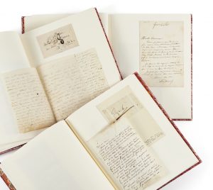 DUMAS, Alexandre père (1802-1870) — Réunion de correspondances d’Alexandre Dumas et à lui adressées — 3 vol. in-4 (31,4 x 24,3 cm) demi-maroquin rubis, dos à nerfs, étui bordé de même peau (reliure XXe siècle).