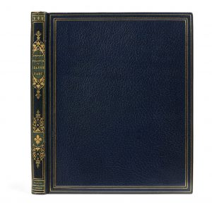 les plats, dos lisse mosaïqué de maroquin vert et beige, bordures intérieures dorées et mosaïquées de maroquin bleu, doublure et garde de soie bleue, étui bordé de même (Ch. Septier rel.).