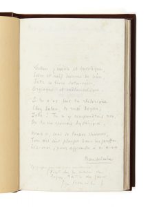 L’exemplaire est enrichi, sur le premier f. blanc du tome I, de la copie par Roger Martin du Gard des 11 premiers vers d’Épigraphe pour un livre condamné de Baudelaire.