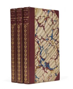 HUGO, Victor (1802-1885) — Notre-Dame de Paris — Paris, Eugène Renduel, 1832 — 3 vol. in-8 (22,6 x 13,5 cm), demi-maroquin lie-de-vin à coins, filets dorés sur les plats, dos lisse orné de motifs dorés en long, couvertures conservées (V....