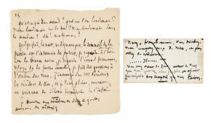 HUGO, Victor (1802-1885) — Réunion de 2 fragments autographes — S.l. [vers 1855] — 2 p. sur 1 f. in-12 (11,4 x 11,6 cm) et au dos d’une carte de visite (8,6 x 5 cm).