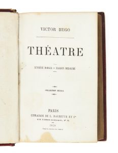 HUGO, Victor (1802-1885) — Théâtre — Paris, Hachette, 1858 — 2 tomes en 1 vol. in-12 (17,1 x 10,6 cm), chagrin rouge, filet doré et filet à froid en encadrement sur les plats, mention de prix dorée au centre, dos à nerfs orné, tranches...