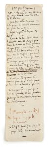Pièce autographe, « Note pour l’imprimeur », de 33 lignes sur une longue bande de papier. Victor Hugo fait part à son imprimeur des corrections à appliquer à l’impression de la première partie de La Légende des siècles : « Mettre en haut des pages, titre courant, au verso, La légende des siècles ». Il profite également de ce mot pour lui rappeler ces consignes de prudence :