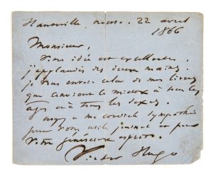 HUGO, Victor (1802-1885) — Lettre autographe signée à Adolphe Royannez — Hauteville, 22 avril 1866 — 1 p. sur 1 double f. in-12 (12,8 x 10,2 cm).