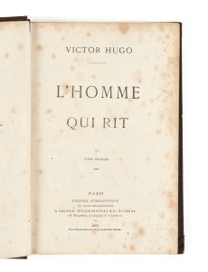 HUGO, Victor (1802-1885) — L’Homme qui rit — Paris, Librairie Internationale, Bruxelles, Leipzig et Livourne, Lacroix, Verboeckhoven & Cie, 1869 — 4 vol. in-8 (21,7 x 14,5 cm), reliure de l’éditeur, bradel percaline brune, encadrement de...