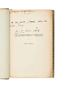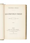 HUGO, Victor (1802-1885) — Quatrevingt-treize — Paris, Michel Lévy frères, 1874 — 3 vol. in-8 (23,2 x 14,9 cm), reliure janséniste maroquin vert, dos à nerfs, dentelle intérieure dorée, tête dorée, couverture et dos conservés (Asper...